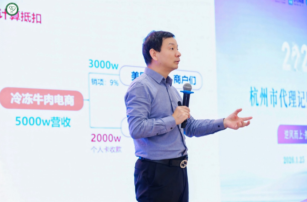 2026年1月25日,何明涛应邀出席杭州市代理记账行业协会年会,并作《电商财税合规业务拓展实践方法论》主题演讲。他以电商行业新趋势为切入点,结合丰富实战案例,深入阐述了代账公司如何把握市场机遇、推进业务转型与升级。演讲中,他还特别介绍了杭州相关园区在电商生态与政策支持方面的优势。整场分享内容翔实、视角前沿,现场互动积极,参会代表普遍表示启发深刻、实操性强。